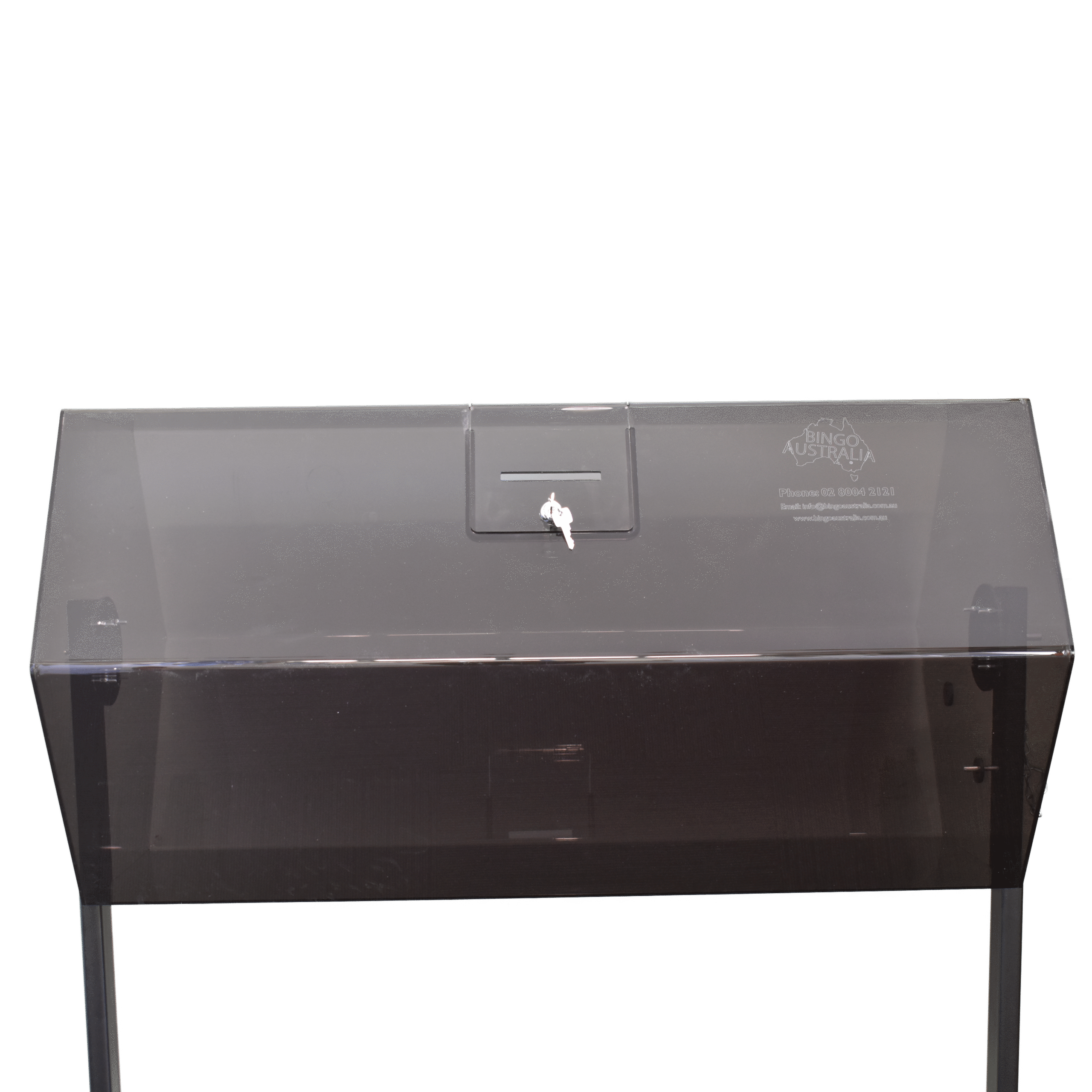 The Floor Standing Raffle Barrel in 4.5mm Grey Tint acrylic is designed to add excitement and professionalism to any promotion. Perfect for retail stores, special events, office raffles, and charity fundraisers, this durable raffle barrel is both eye-catching and practical. Constructed from strong grey-tinted acrylic, it features a spacious 1000 x 600 mm drum with a secure lockable door measuring 162 x 200 mm. Mounted on a sturdy metal stand with wheels, the barrel can be easily moved and positioned wherever needed. Finished with the Bingo Australia logo, it combines security, mobility, and visual appeal for any promotional draw.
