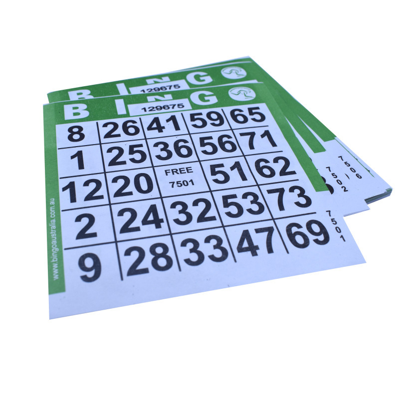 Our 75 numbered Bingo sheets are a 5×5 grid filled with random numbers up to number 75. The center space is automatically marked as a ‘free space’.