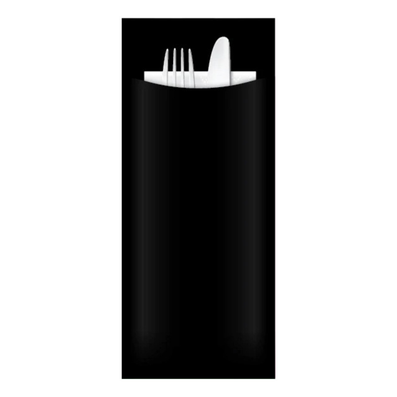 Available in multiple sizes and options, including pouch-only, 2-ply, and 3-ply white napkin inserts, each pouch ensures convenience and consistent presentation across various service settings. The white napkin (330mm x 330mm) contrasts beautifully with the black pouch for a stylish, professional appearance.
