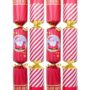 Add a touch of playful holiday spirit to your table with the BONS3110 Red & White Santa & Candy Stripe with Gold Bon Bons. This festive mix of designs features alternating red and white patterns, including candy swirls, cheerful Santas with rosy cheeks, and shiny gold stars. Each cracker is tied at the ends with gleaming gold ribbons, creating a joyful, eye-catching display that’s perfect for both traditional and modern Christmas settings.