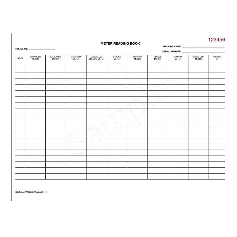 The Poker Machine Meter Reading Book is a must-have tool for gaming venues, casinos, and other establishments that need to systematically track poker machine meter readings. With a professional design that prioritizes clarity and organization, each book contains 50 pages, with 18 lines per page, providing ample space for accurate and detailed record-keeping. Sized at A4 (30 cm x 21 cm), the books offer a comfortable writing area for daily use. Sold in a convenient bundle of 4 books, this product ensures your operations are well-supplied, enabling you to maintain comprehensive records of meter readings, maintenance logs, and more. Ideal for use in compliance reporting and routine machine checks, the Poker Machine Meter Reading Book is durable, easy to store, and designed to handle the demands of the gaming industry.