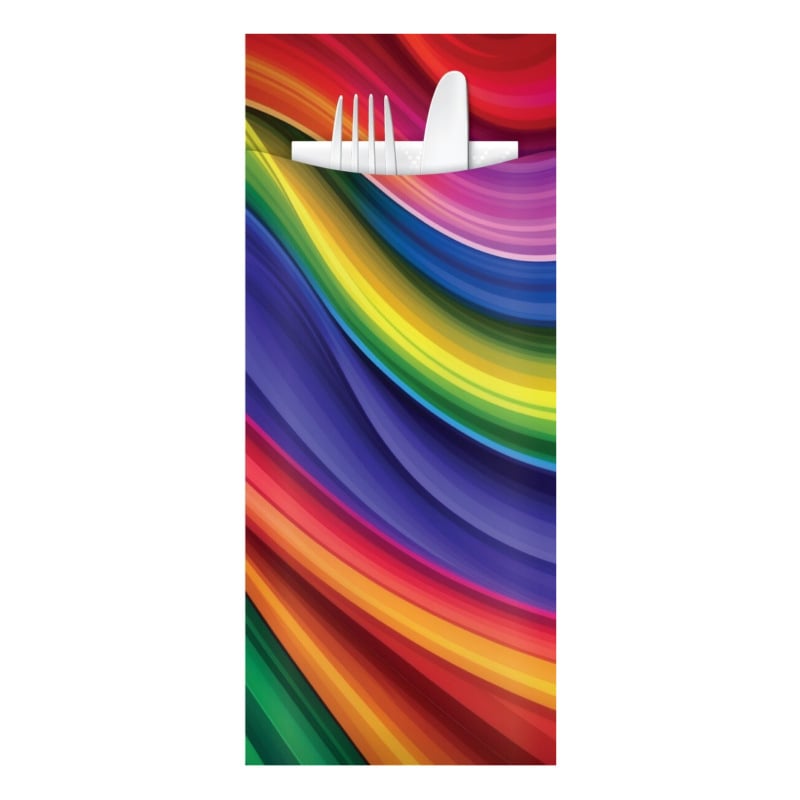 Brighten up any table setting with the Rainbow Design Cutlery Pouch. Each pouch features a colorful rainbow design and comes with a 3-ply white napkin (330mm x 330mm) inserted, making it both practical and visually appealing. 1,000 pouches per box.